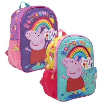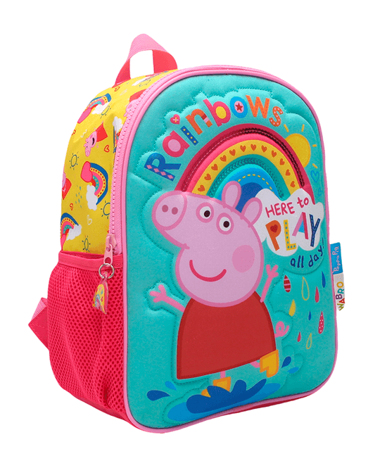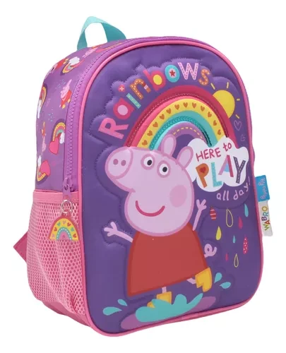 Esta mochila de 30 cm es perfecta para que los niños lleven sus cosas con alegría y comodidad, acompañados por la simpática Peppa Pig y sus arcoíris llenos de color.