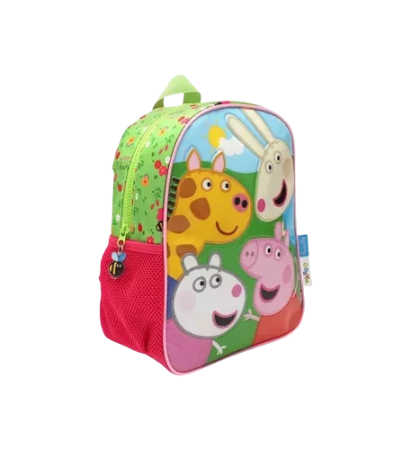 Perfecta para los pequeños fanáticos de la famosa cerdita. Esta mochila no solo es colorida y divertida, sino también práctica y cómoda para el uso diario. Con un diseño vibrante que muestra a Peppa junto a sus amigos, es ideal para llevar al colegio, de excursión o para cualquier actividad. Además, cuenta con un amplio compartimento principal con cierre de cremallera, bolsillos laterales para botellas, y correas ajustables para mayor comodidad. Sin duda, es el complemento perfecto para cualquier aventura infantil.