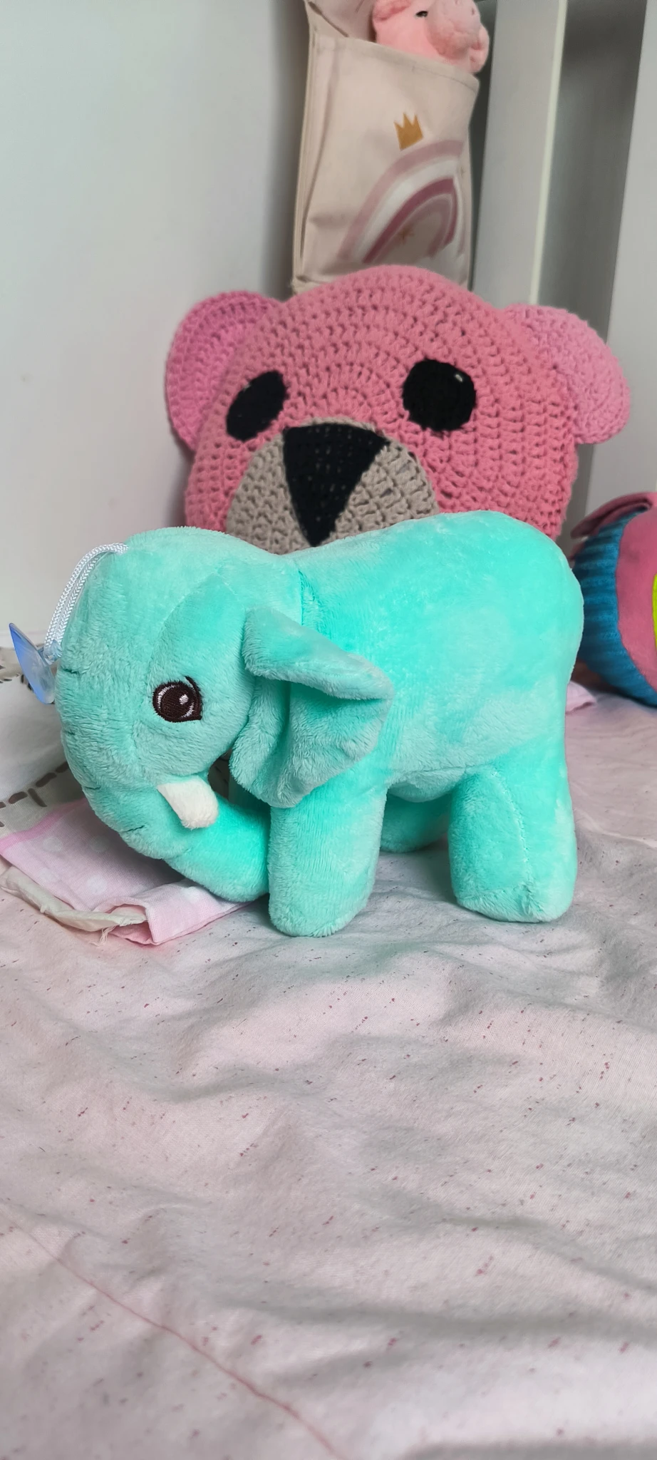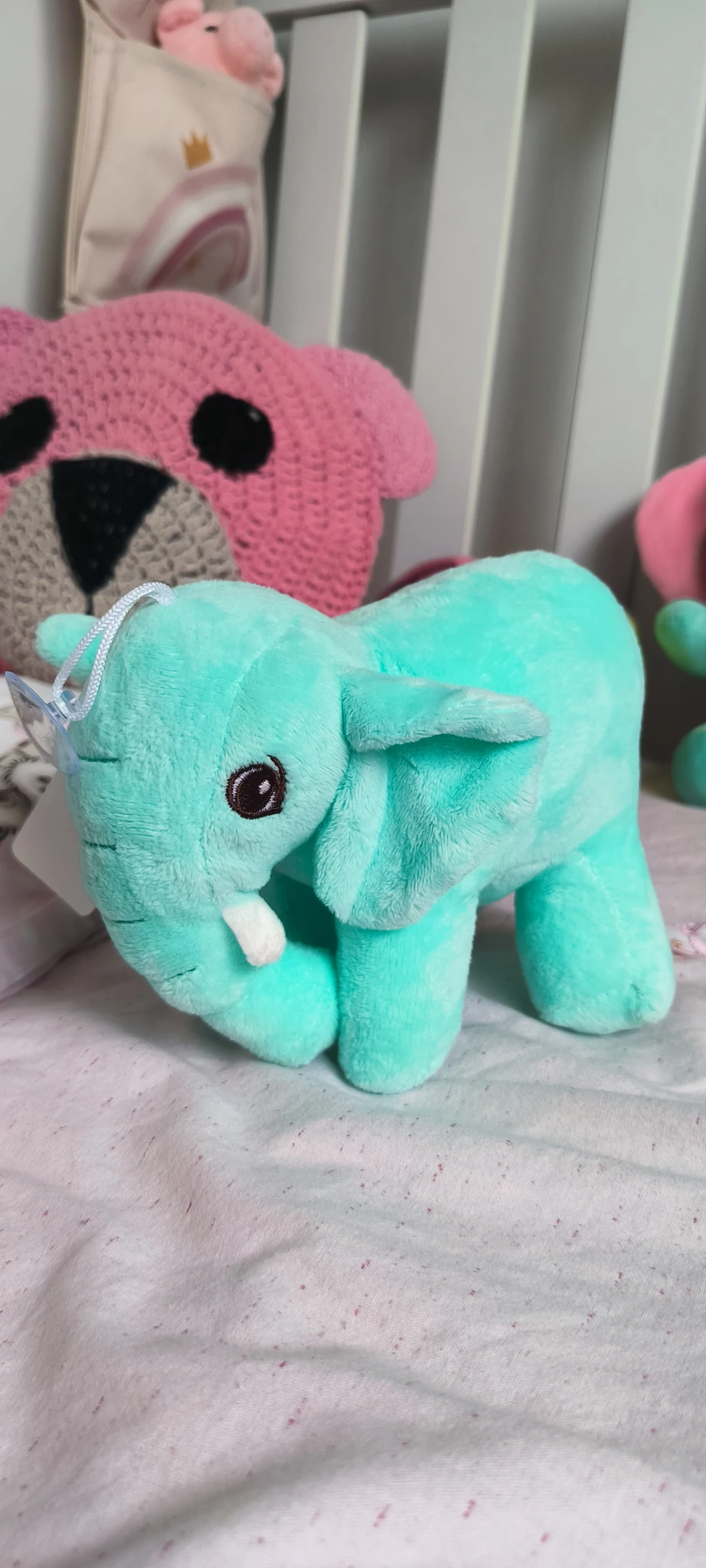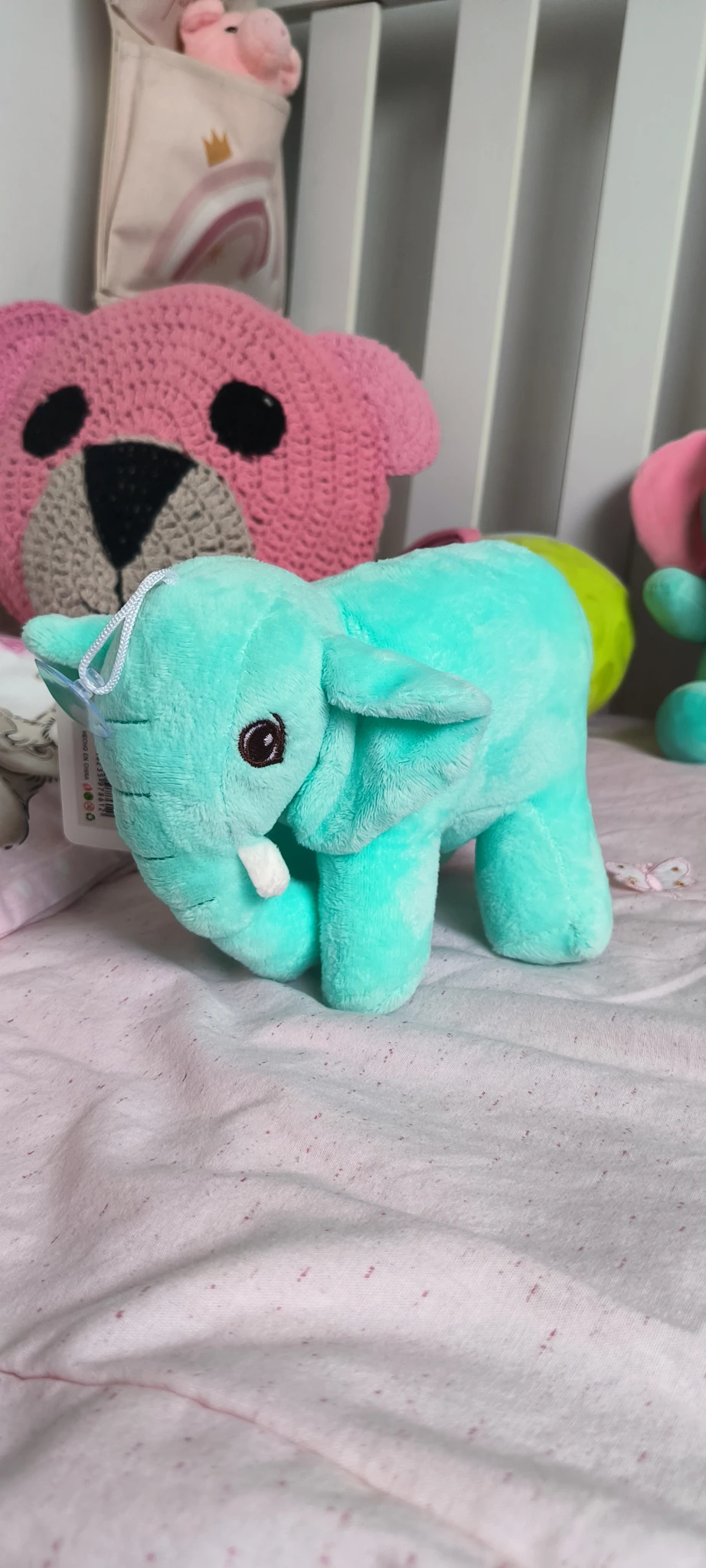 Este adorable elefantito de peluche mide 17 cm de largo y está disponible en colores verde y celeste, perfectos para acompañar a los más pequeños en sus aventuras.