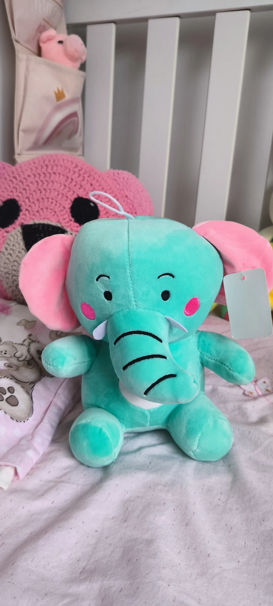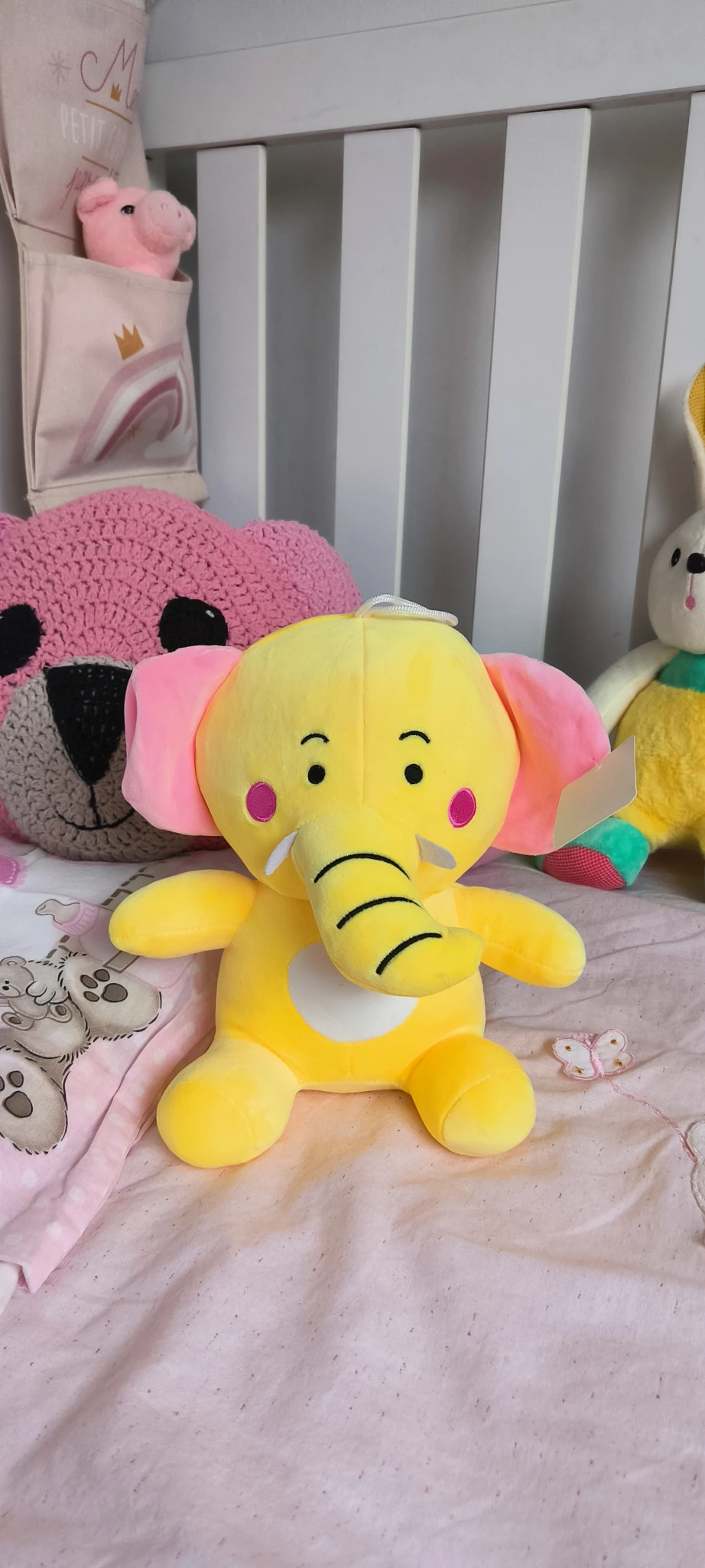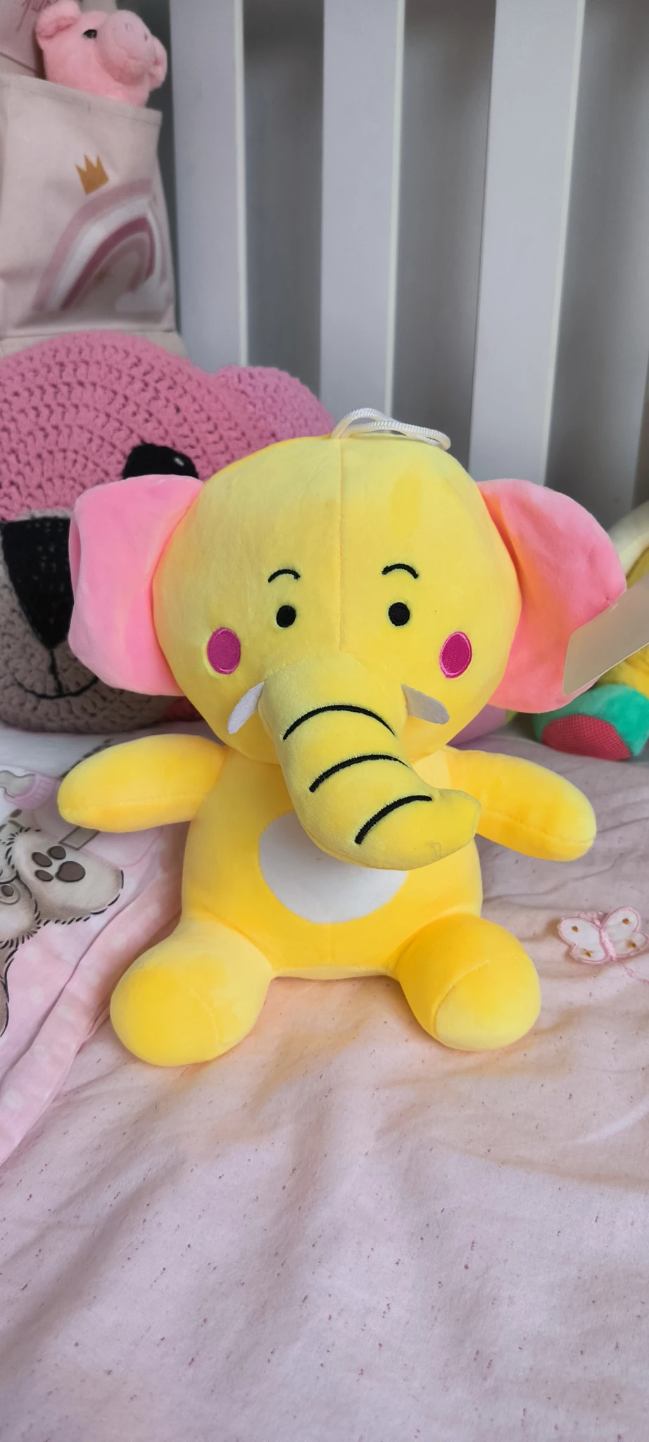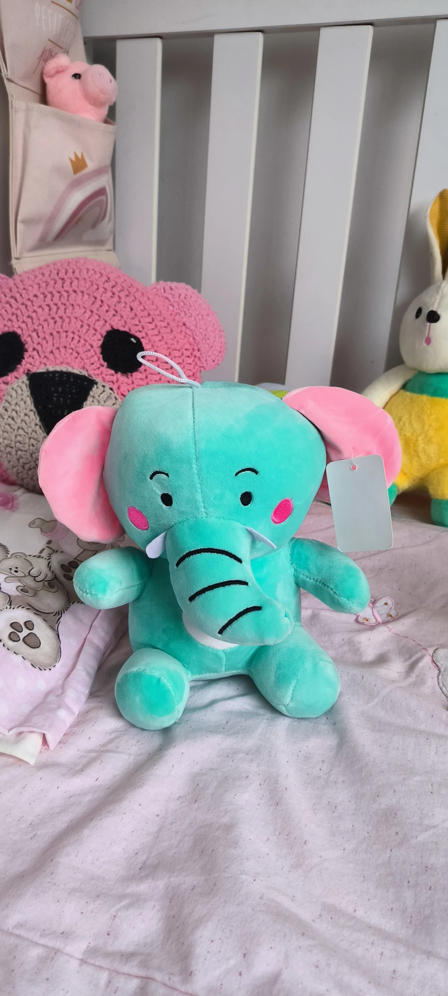 Este encantador elefante de peluche mide 24 cm y viene en colores amarillo, rosa, gris o verde, ideales para todos los gustos. Su diseño simpático y textura suave lo hacen perfecto para abrazar y decorar.