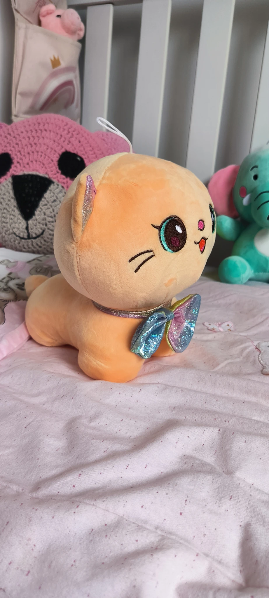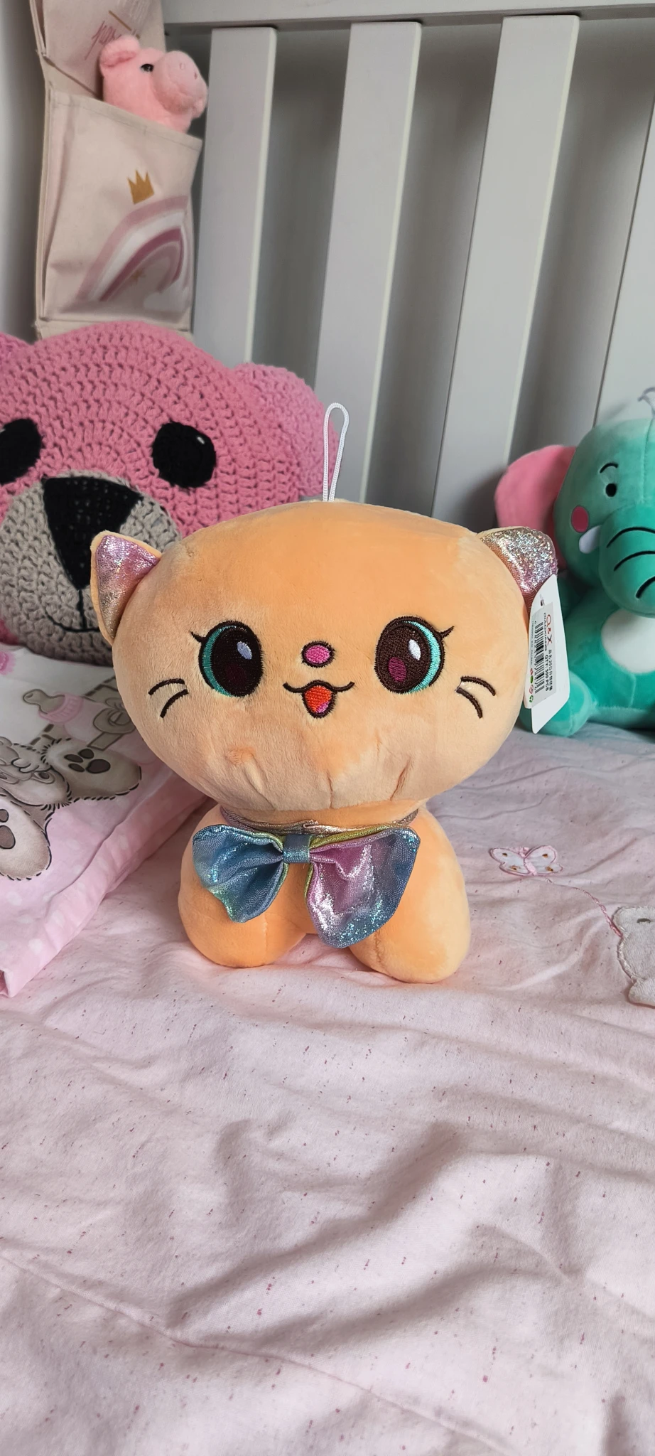 Este encantador gato de peluche mide 22 cm de alto y viene con un delicado moño que lo hace aún más adorable.