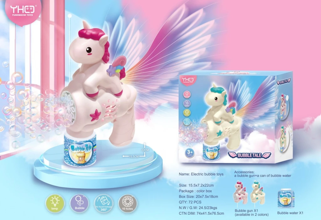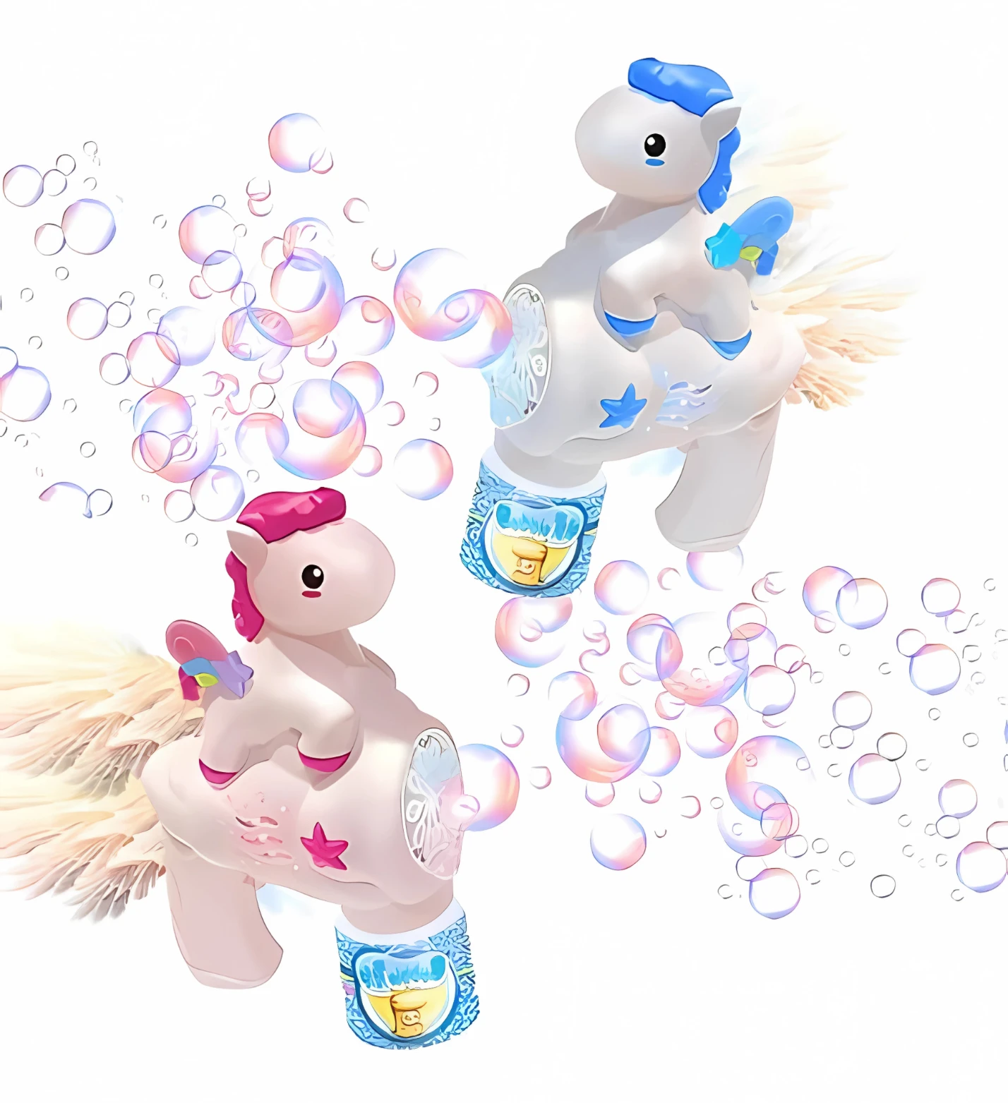 Dejá que la fantasía y la alegría cobren vida con este encantador lanzador de burbujas con forma de unicornio de la marca Bubble Tale, ideal para niños a partir de 3 años.